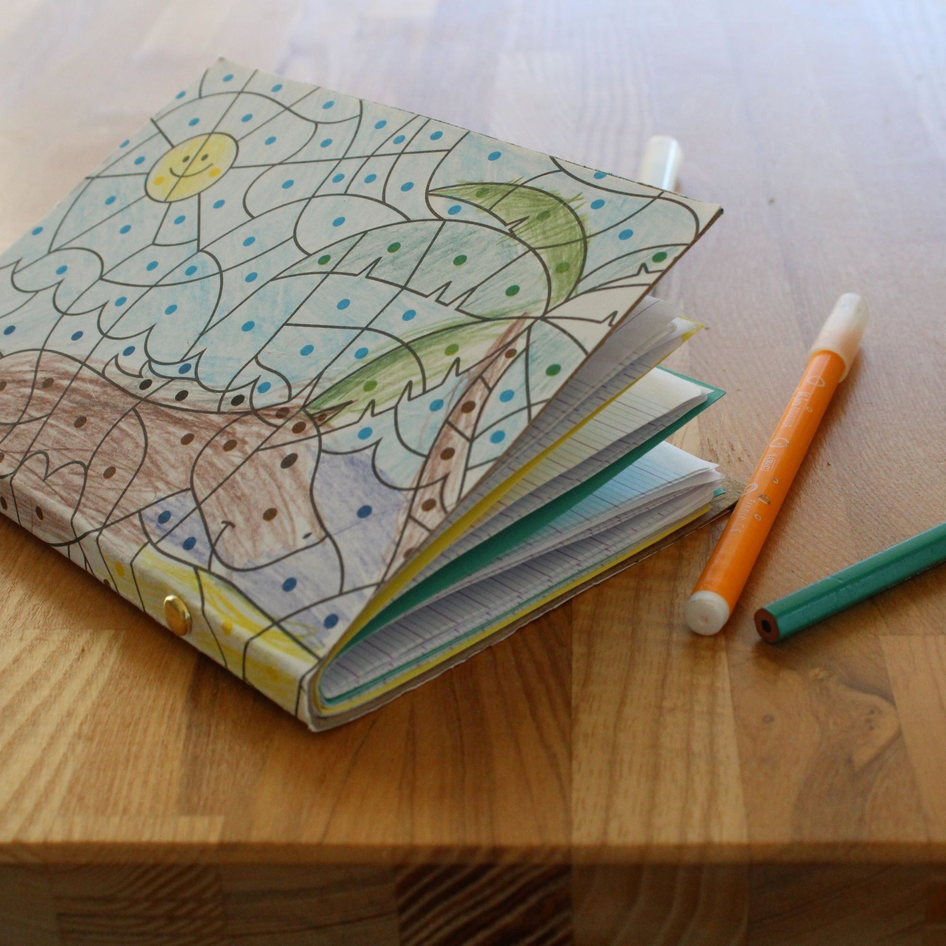 pour apprendre à réutiliser des feuilles de papier, et fabriquer son carnet unique, joliment décoré d'un coloriage mystère.